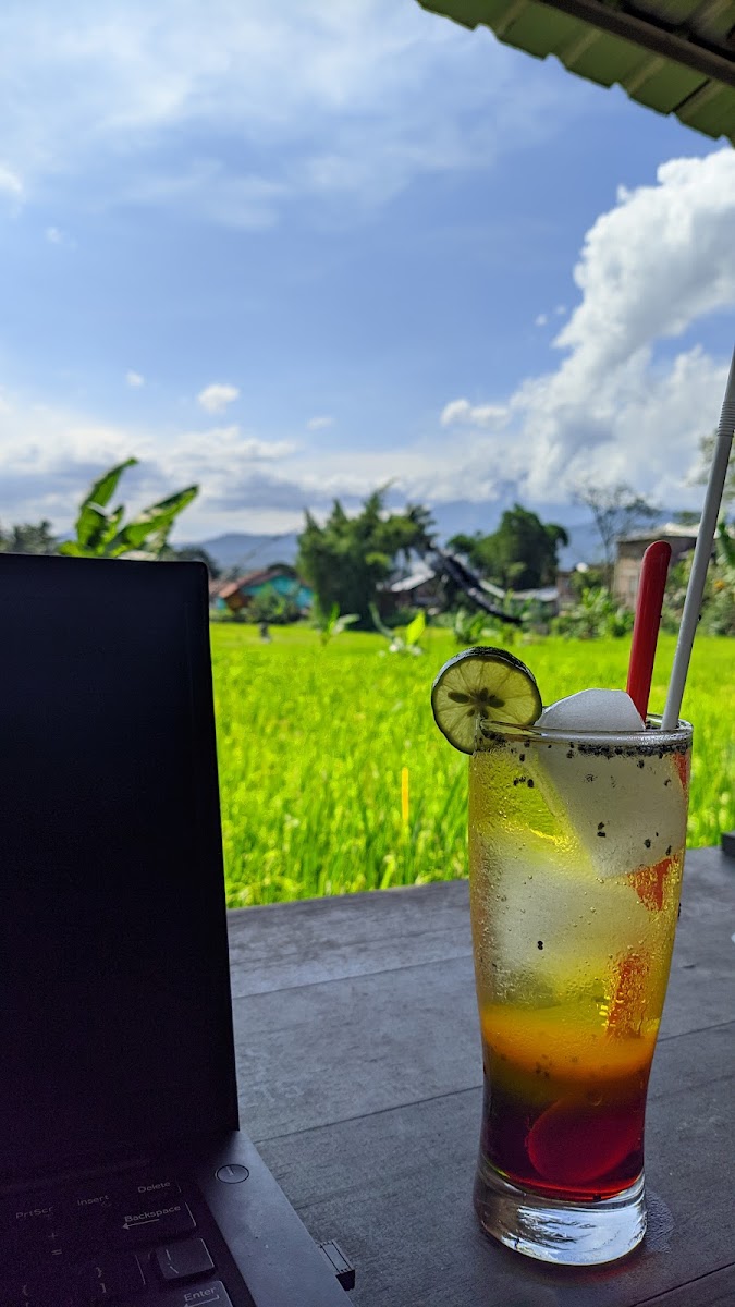 The café is embraced by lush rice fields and a gentle river, providing a picturesque backdrop that enhances your dining experience. Whether you're seated inside the cozy interior or taking in the fresh air on the outdoor patio, the atmosphere is always calm and inviting—perfect for a quick study session, a casual meeting, or simply a moment of solitude.